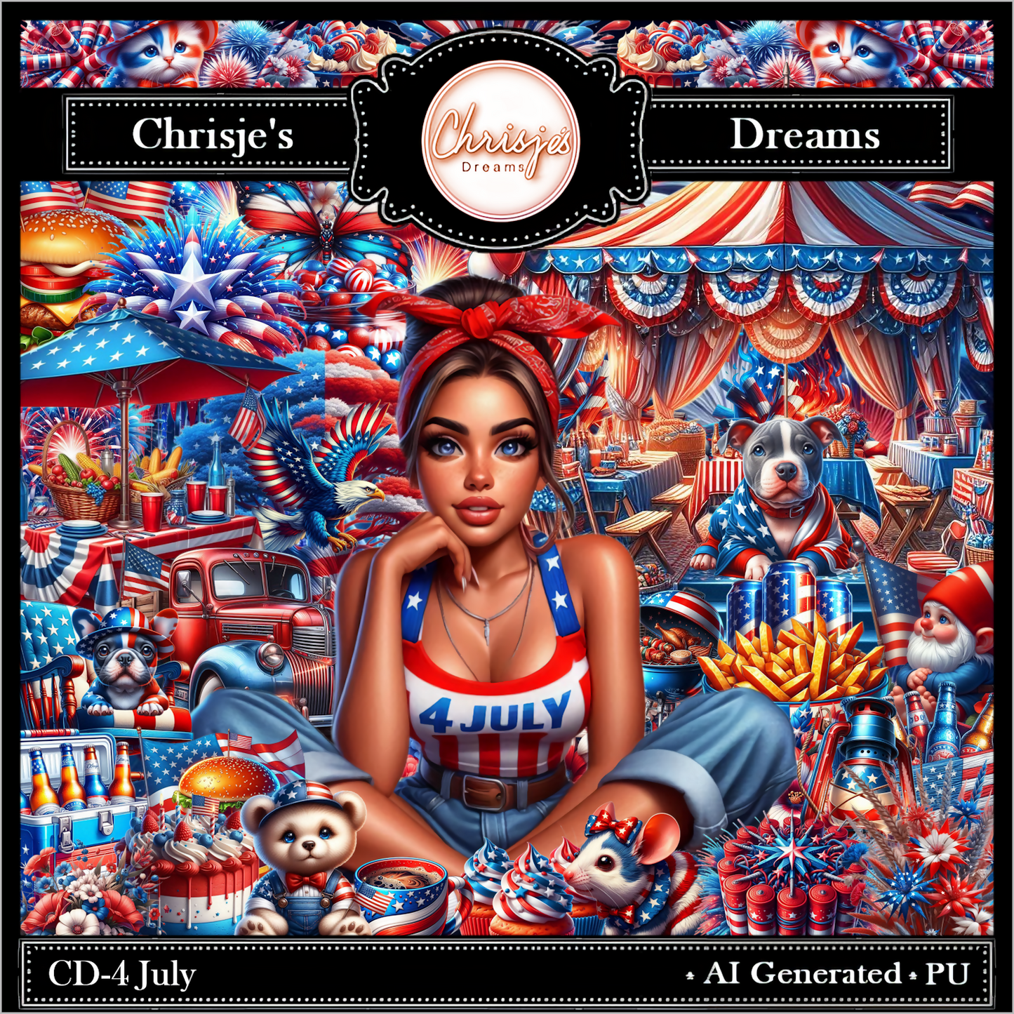 4 July is a 4 July themed kit which contains 95 elements, 8 papers and 2 beautiful AI generated png tubes by Chrisje's Dreams.