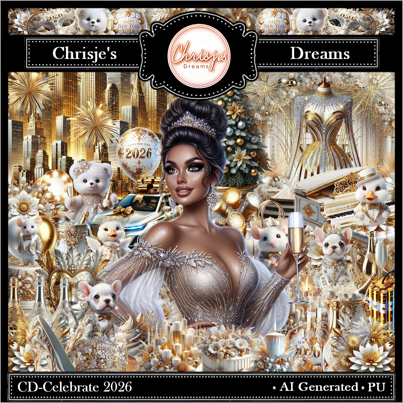 Celebrate 2026 is a 🍾new years 🍾 themed kit which contains 120 elements, 9 frame's, 14 papers and 3 beautiful AI generated png tube's by Chrisje's Dreams.
