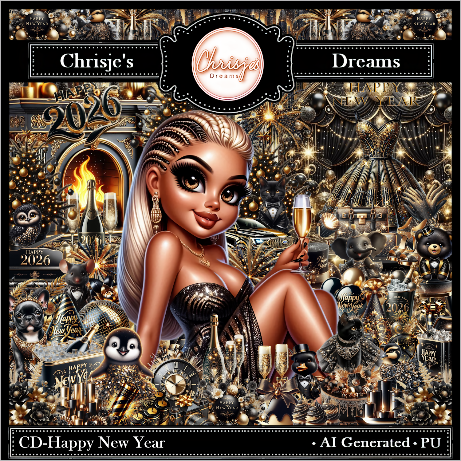 Happy New Year is a 🍾new years 🍾 themed kit which contains 199 elements, 13 frame's, 26 papers and 4 beautiful AI generated png tube's by Chrisje's Dreams.