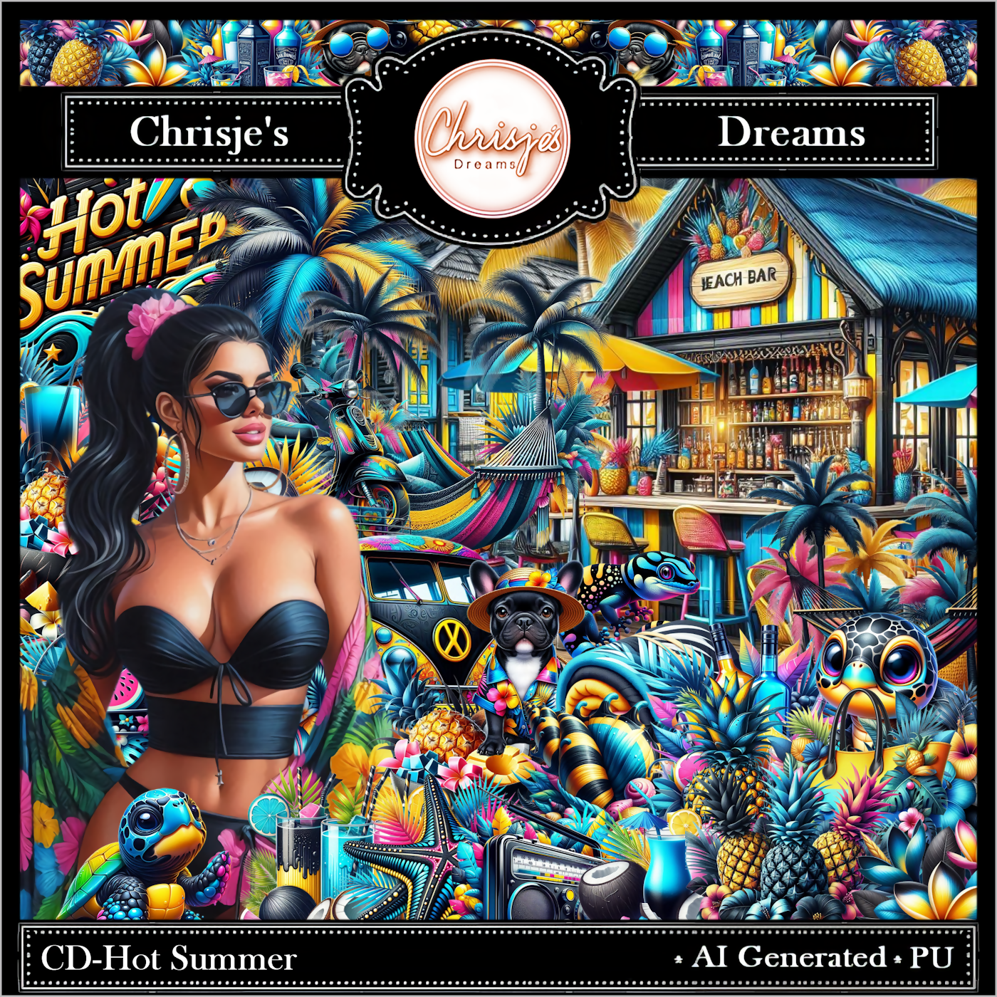 Hot Summer is a ☀️🍹Summer☀️🍹 themed kit which contains 128 elements, 6 frames, 12 papers and 2 beautiful AI generated png tubes by Chrisje's Dreams.
