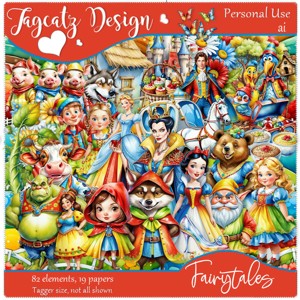 Fairytale fun with all your favorite characters and the elements of their stories. Red Riding Hood, Goldilocks, Snow White, the three little pigs, Cinderella and Jack and the Beanstalk. AI product. 82 elements and 19 matching papers. Personal use only. Tagger size. Not all shown.