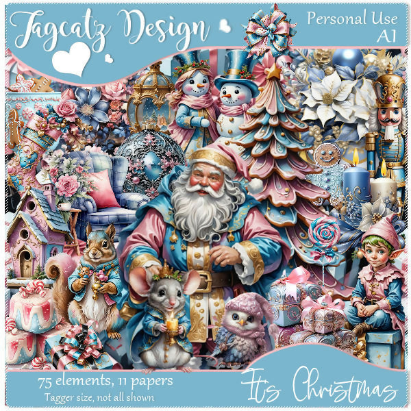 75 elements, 11 papers celebrating the Christmas season. AI product. Not all shown. Includes two Santa tubes. Tagger size. Personal Use.