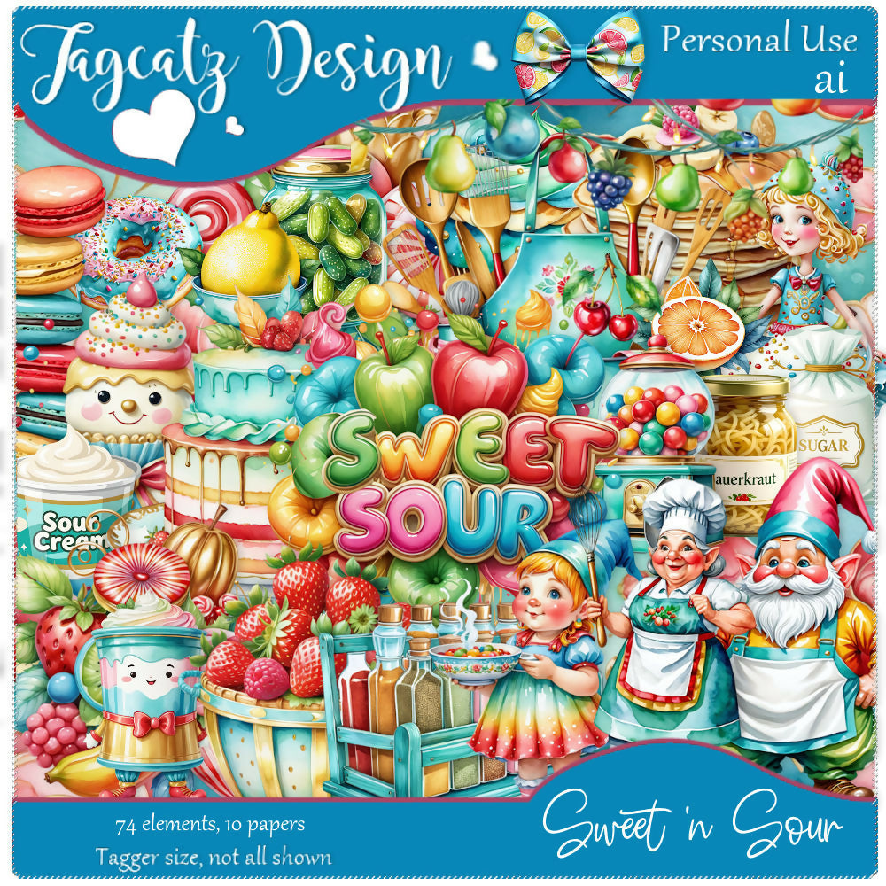 Tickle your taste buds with things sweet and sour! Cute kit with some adorable gnome chefs too. 74 tasty elements and 10 matching papers. AI generated. Tagger size. Not all shown. Personal use only.