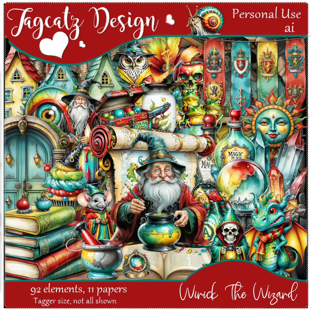 Wirick the Wizard and all his potions, spells, and sundry magical creatures. Contains 5 tubes. AI product. Tagger size. Personal use only. Not all shown.